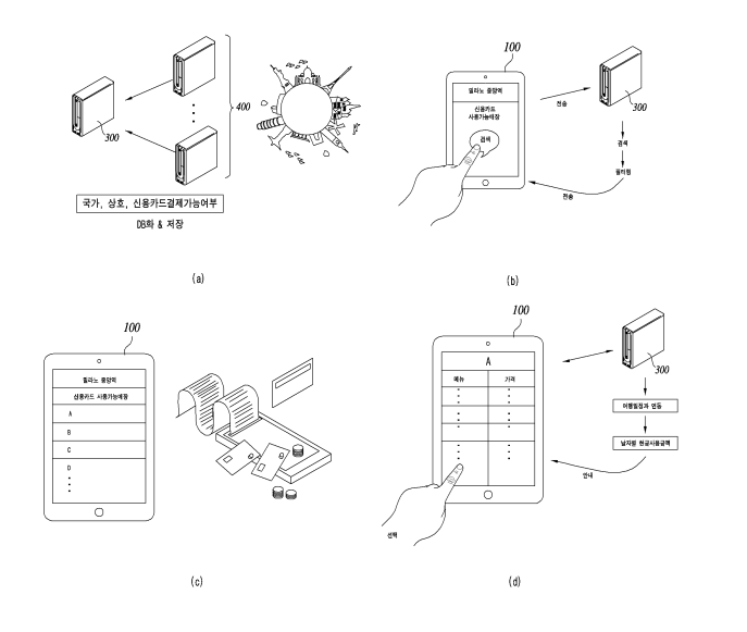 해외 신용카드 결제가능 매장 검색 서비스 제공 시스템이 제공되며, 여행지의 국가, 위치, 상호, 주소 및 적어도 하나의 종류의 결제가능 신용카드를 포함하는 여행자 데이터를 등록하는 적어도 하나의 여행자 단말, 실시간 위 치 또는 입력된 위치를 기준으로, 기 등록한 종류의 신용카드로 결제가능한 적어도 하나의 매장을 리스트업 (Listup)하여 출력하는 사용자 단말 및 적어도 하나의 여행자 단말에서 등록한 여행자 데이터를 국가, 위치, 상 호 및 주소와 매핑하여 저장하는 저장부, 사용자 단말에서 실시간 위치 또는 입력된 위치를 전송하는 경우, 실시 간 위치 또는 입력된 위치를 기준으로 신용카드 결제가능 매장을 필터링하여 사용자 단말로 전송하는 전송부를 포함하는 매장 검색 서비스 제공 서버를 포함한다.